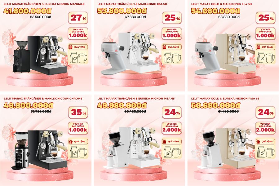 - Giảm giá đến 55% cho nhiều dòng máy pha cà phê, máy xay cà phê, máy xay sinh tố và ấm pha cà phê đến từ các thương hiệu nổi tiếng hàng đầu thế giới như: Wega, Astoria, Saeco, Lelit, Gaggia, Eureka, Mahlkonig, Vitamix, Bialetti,…